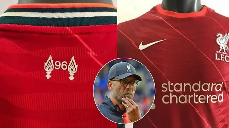 Джерси Nike «Ливерпуля» на сезон 21-22 сочетает в себе красную основу с диагональными полосами, включающими зигзагообразные, а также ярко-красные манжеты на рукавах. Зигзагообразный узор на футболке выглядит как рисунок молнии (⚡).