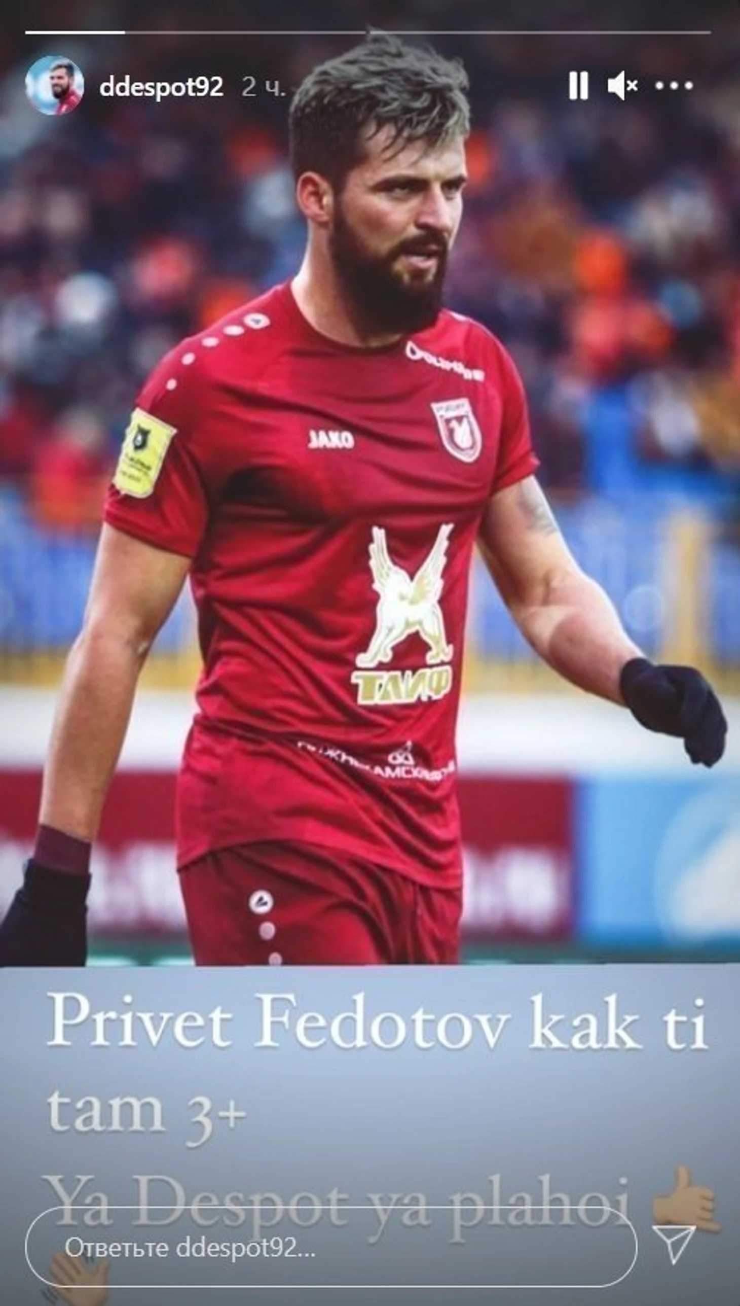 Возвращаемся к истории с Владимиром Федотовым. Не так давно «Рубин» вместе с Дордже обыграл «Сочи», которым сейчас руководит этот русский тренер. Ну и Деспотович, которого Федотов в «Оренбурге» явно недооценивал, решил ответить тому в сторис, написав: «Привет, Федотов, как ты там? Я – Деспот, Я – плохой».