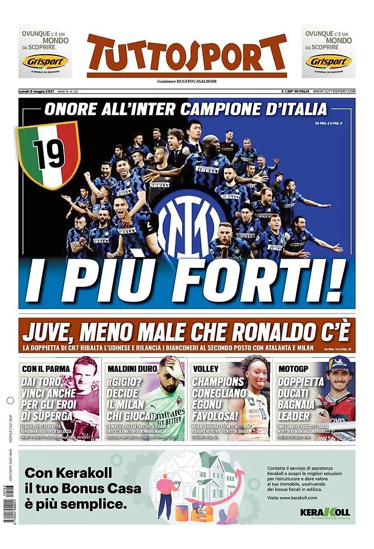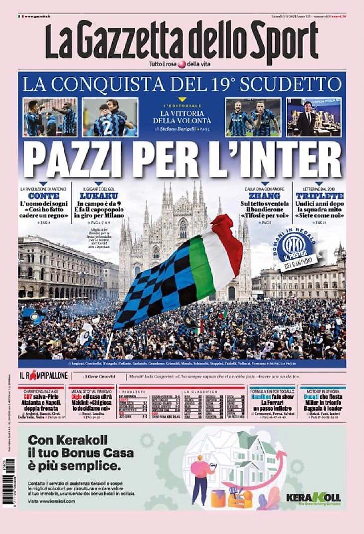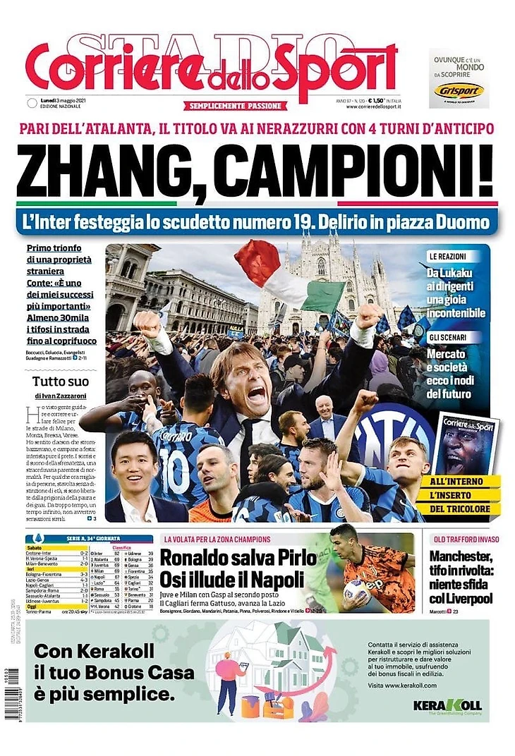 Ничья «Аталанты», титул уходит к Нерадзурри за 4 тура до окончания. «Интер» празднует Скудетто под номером 19. Экстаз на площади Дуомо. Первый триумф иностранных владельцев. Конте: «Это один из моих самых важных успехов». По меньшей мере 30 тысяч болельщиков на дорогах вплоть до комендантского часа.