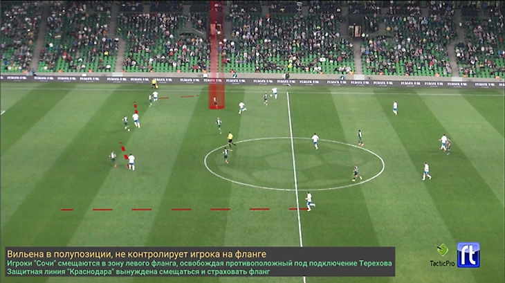Уязвимым местом «Краснодара» при оборонительных действиях являлась зона левого защитника. Использование Вильены на позиции левого защитника определенно вынужденный эксперимент, связанный с травмами всех игроков этой позиции. При оборонительных действиях Вильена оказался слабым звеном «Краснодара». Играя на новой для себя позиции, Тонни постоянно оказывался в полупозиции, зависал при переходных фазах, выдвигался без подстраховки. Как итог, большинство опасных атак «Сочи» строилось именно через фланг Вильены.