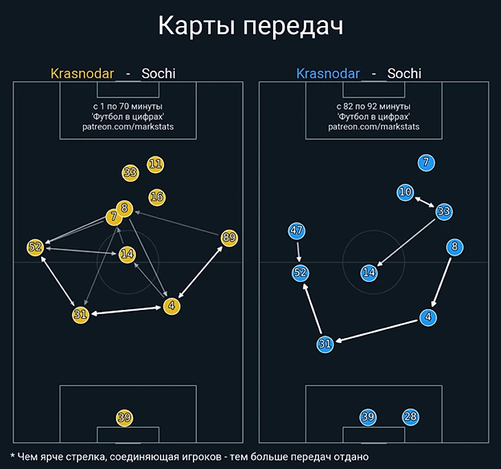 При оборонительных действиях игроки «Сочи» располагались компактно в низком блоке. Тройка центральных защитников контролировала вбегания игроков группы атаки «Краснодара». Большинство позиционных атак «быков» свелось к постоянной смене направления. Поскольку смена направления чаще всего производилась через центральных защитников, «барсы» успевали перестраиваться.