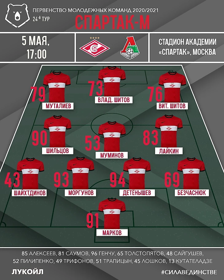 Состав. Сразу пять игроков, которые провели матч «Спартака-2» на скамейке запасных, вышли в с первых минут в составе молодежки: Ильяс Муминов, Константин Шильцов, Максим Лайкин и братья Шитовы. Кроме того, за дубль сыграл Илья Детёнышев, пропускавший игру «двойки» из-за дисквалификации.