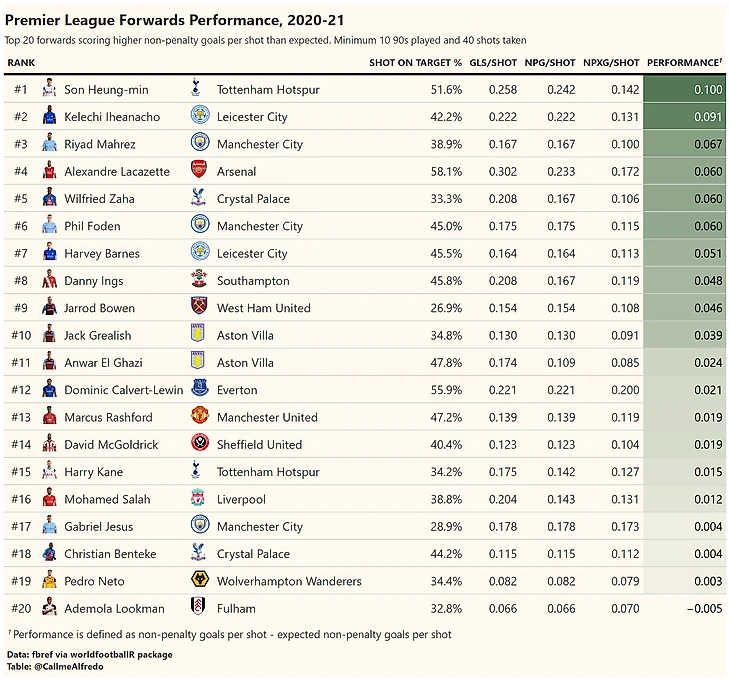 Топ-20 футболистов АПЛ сезона 2020/21 по реализации ударов
