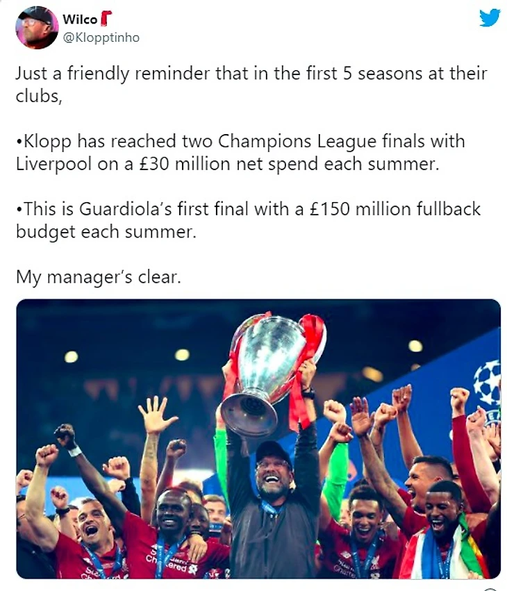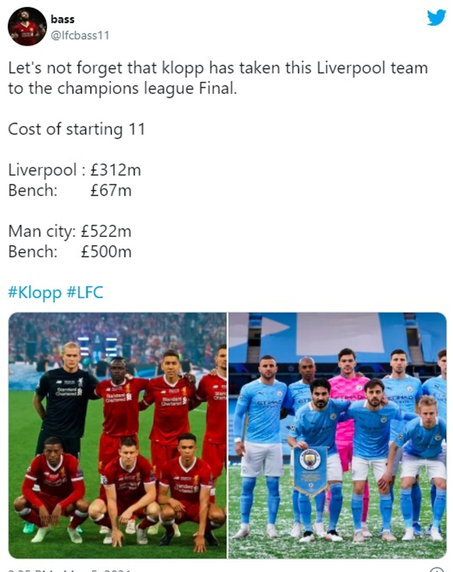 Болельщики «Ливерпуля» в Twitter проводят сравнительный анализ достижений Юргена Клоппа в клубе с прогрессом «МанСити» в Премьер Лиге и в Европе, отмечая большую разницу в финансовом положении клубов.