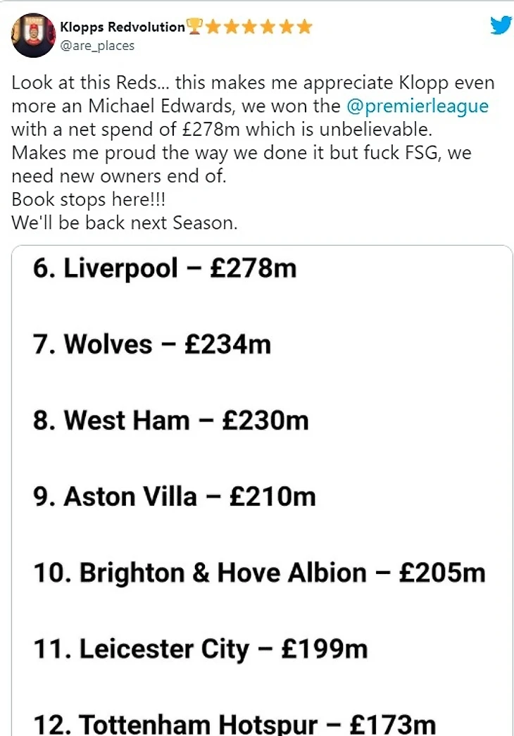 «Вы только посмотрите на это, «красные»…глядя на эти данные я еще больше ценю Клоппа, чем Майкла Эдввардса. Мы выиграли Премьер Лигу, потратив 278 млн фунтов – это невероятно. Я горжусь тем, как мы это сделали, но нафиг FSG – нам нужны новые владельцы.