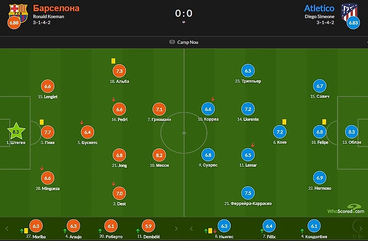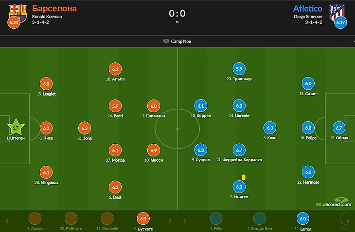 Куман после матча на "Месталье" не стал менять ничего, кроме сочетания защитников: вместо Араухо в старте вышёл всё тот же Мингеса. Как мы уже знаем, это решение голландцу аукнулось. Ещё одна задумка, которая "Барселоне" в первом тайме испортила игру, а её болельщикам - нервы, это отказ от прессинга. Обычно высоко встречающая соперника Барса в этом матче стояла средним блоком. Видимо, Куман боялся контратак "Атлетико" и решил таким образом справиться с ними, но стало только хуже. Любой обрез в центре поля приводил к опасному выходу к воротам сине-гранатовых, а игры в атаке у каталонцев не было вообще. "Барселона" стала пассивной, и бегущему "Атлетико" было очень легко: они хорошо контролировали мяч, спокойно доводя его до штрафной каталонцев, а низкая линия бороны Барсы позволила им отказаться от бессмысленных забросов на медленного Суареса и комбинировать на флангах. Короче говоря, Симеоне даже стараться не пришлось, Куман сам практически сдал ему игру в первой половине встречи. Если бы не Тер Штеген, который был определённо лучшим игроком Барсы в первом тайме, "Атлетико" мог бы закрыть все вопросы уже к перерыву. Удары Суареса, Корреа и проход Карраско были голевыми моментами, но либо оборона каталонцев судорожно отбивалась, либо в игру вступал немецкий вратарь. Тер Штегену в последних матчах очень не везло: он пропустил 8 голов после 15 ударов по своим воротам. И в этой игре он наконец показал лучшую версию себя и потащил всё, что нужно было, не дав "Атлетико" открыть счёт.