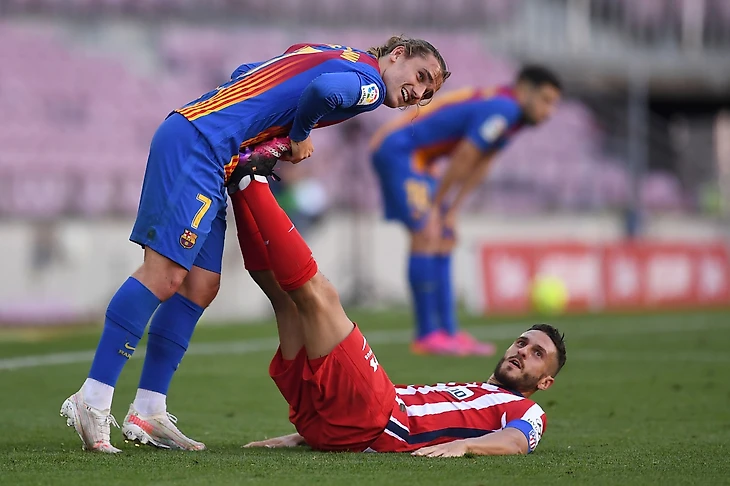 Нельзя сказать, что вынужденная замена Лемара на Сауля помешала "Атлетико" также сильно, как помешала Барсе замена Бускетса на Мориба. Да, матрасники немного потеряли в скорости и атакующем потенциале на своём левом фланге, но при этом укрепят тот же фланг и практически обезопасят свою штрафную от всяческой угрозы со стороны игроков Барсы. Никто, кроме Месси, в первом тайме не представлял для "Атлетико" серьёзной угрозы. Сине-гранатовые медленно принимали решения и полагались на принцип "отдай мяч Месси, он что-нибудь придумает". Это признак отчаяния. Сам Месси находился на том же фланге, где и Дест с Мингесой, но не мог в полной мере рассчитывать на их подключения из-за опасности контратак - им приходилось оставаться ниже. Гризманн тоже провёл плохой матч и был неактивен. Потому одного Месси встречали Сауль, Коке и Эрмосо. Да, он может справится и с ними, что он и продемонстрировал в конце тайма своим проходом, но игроков "Атлетико" мало обыграть, от них надо ещё и убежать. Если они проигрывали Лео позицию, то просто фолили. За весь матч он собрал на себе аж девять фолов.