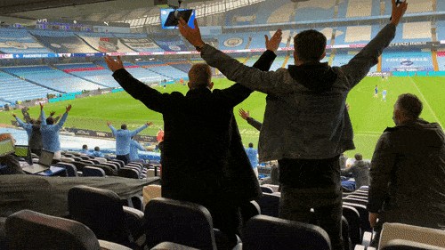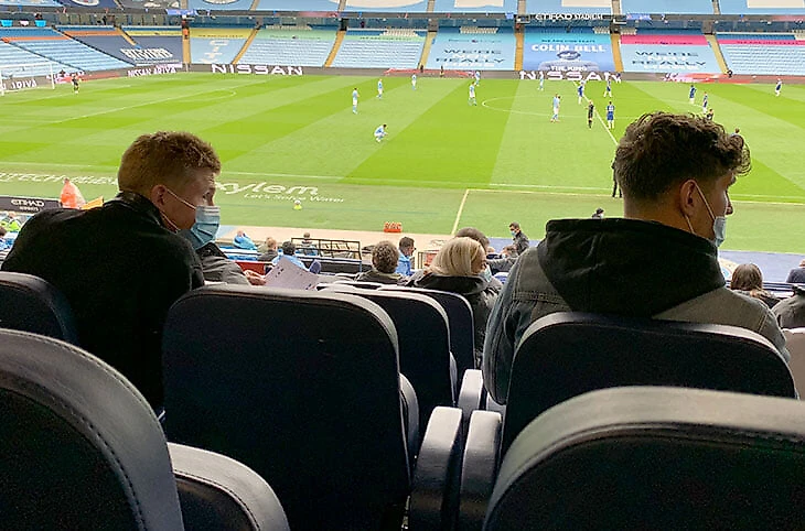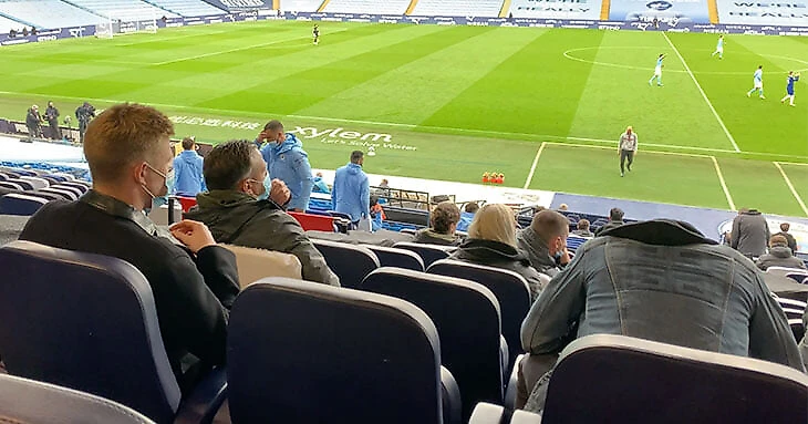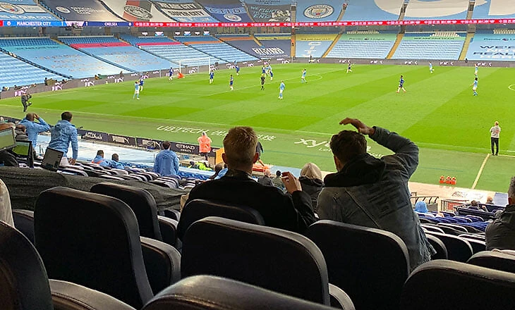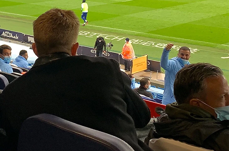 Синяя часть Манчестера остается одной из самых гостеприимных в пандемию: без болельщиков журналистов здесь рассаживают прямо за скамейками запасных, растянувшихся на вип-сектор (а значит и места с подогревом). Почти опоздавшей из-за поезда мне выдали последнее свободное кресло, огороженное со всех сторон камерами и рекламными бортами. Чтобы пробраться на него пришлось перелезать через спинки кресел, зато со стартовым свистком я получила лучших соседей по трибуне: прямо перед мной вместе с аналитиками и тренерами «Сити» оказались Кевин де Брюйне и Джон Стоунз.