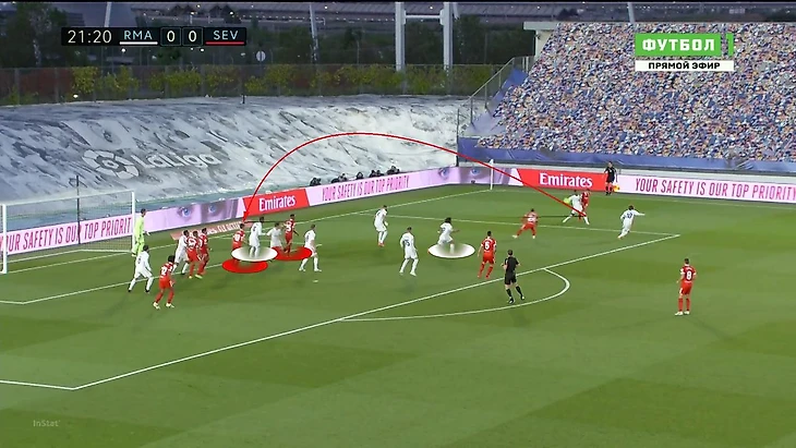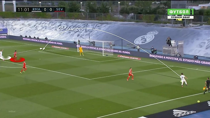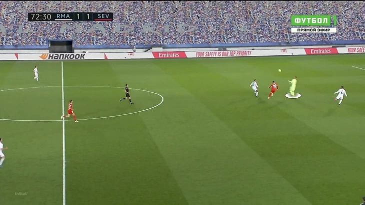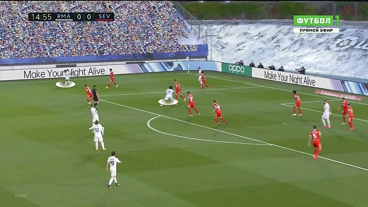 Такая ситуация возникла благодаря прессингу Тони Крооса, который здорово накрыл Жордана, а дальше ему помогли Бензема с Вальверде. Такое численное неравенство было смертиподобно для «Севильи», игроки «Реала», очень здорово разобрались в этом эпизоде, особенно нужно отметить Крооса, который выдержал гроссмейстерскую паузу перед голевой передачей.