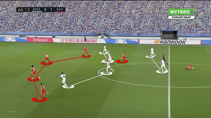 У «Севильи» из-за роли ложной девятки Папу Гомеса и заточености на навесы при атаках штрафную площадь заполняли Окампос и Фернандо. Папу в свою очередь уходил в глубину чуть ли не на позицию Жоана Жордана, который в это время страховал зону Фернандо. Таким образом при навесах в штрафной находились Окампос и Фернандо, а Ракитич и Гомес играли на одной линии. У «Мадрида», как я уже писал выше в таких эпизодах образуется оборонительная линия из пяти человек.