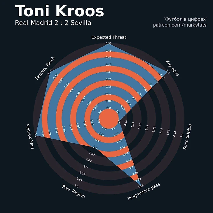 Лучшим игроком матча, на мой взгляд, был Тони Кроос. Немец великолепно делал все в этой встрече. Вот немного статистики Крооса в этом матче: 104 успешных передач из 114 попыток (1 ассист, 3 под удар, 10 с продвижением, 32 на трети соперника), 1 удара, 1 возврат владения (перехваты + отборы), 0.55 очка xT (+0.0 со стандартов).