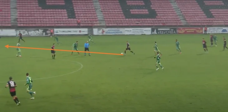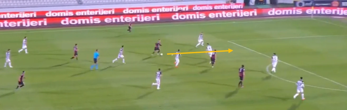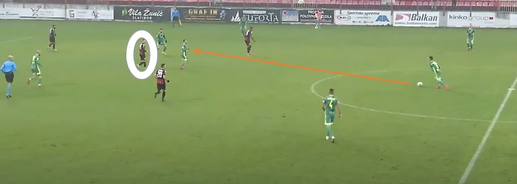 Ниже пример чтения игры и перехвата мяча. Кнежевич опекает зону, в которой сразу двое соперников. Игрок в центральном круге сместился чуть ближе к атаке и направил туда передачу - Кнежевич выдергивается и опережает двух футболистов на мяче.