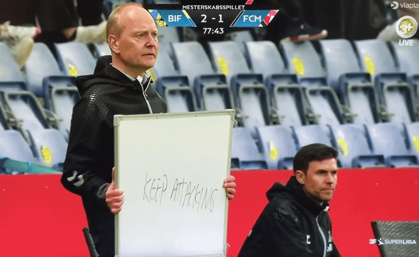 Во втором тайме «Брондбю» забил второй, но тренеру Нильсу Фредериксену все равно не нравилась игра его команды. На 77-й минуте он вышел к кромке поля с тактической доской, на которой черным маркером написал «Продолжаем атаковать».