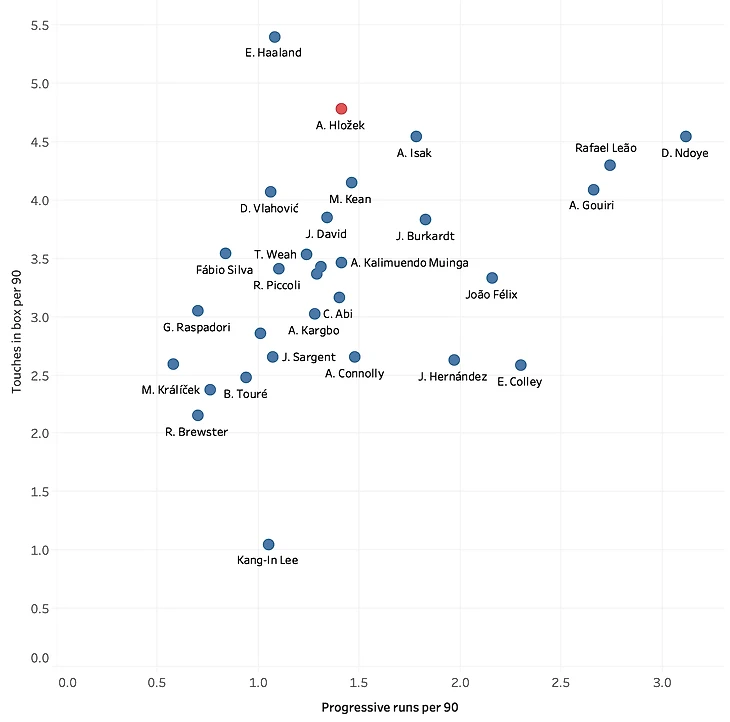 Ниже два скриншота, которые лишь подтверждают что Адам уже перерос чемпионат Чехии. Просто взгляните на сравнение его действий, с другими нападающими U-21 из топ-5 лиг. Отдельно обращу ваше внимание на кол-во касаний в штрафной площади (вторая картинка на Оси "Y")