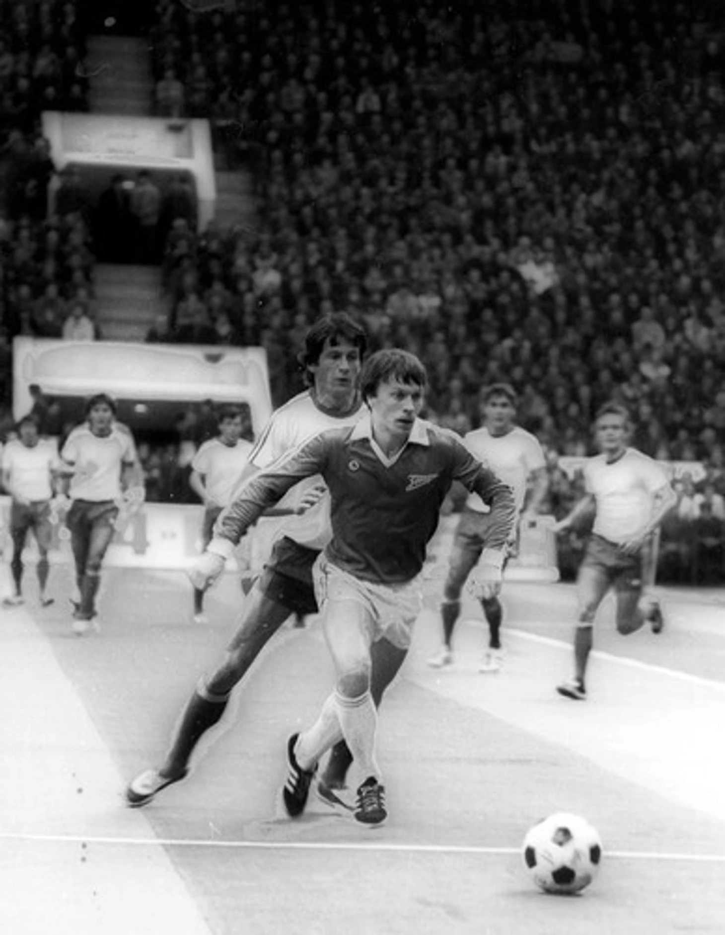 1984г. Зенит(Ленинград) - Металлист(Харьков) 4:1. Чемпионский аккорд Зенита. В борьбе за мяч капитан ленинградцев - Н.Ларионов и недавний новичок Металлиста- И.Талько(в белом)- сразу очень органично вошедший в основной состав на ключевой позиции поднападающего...