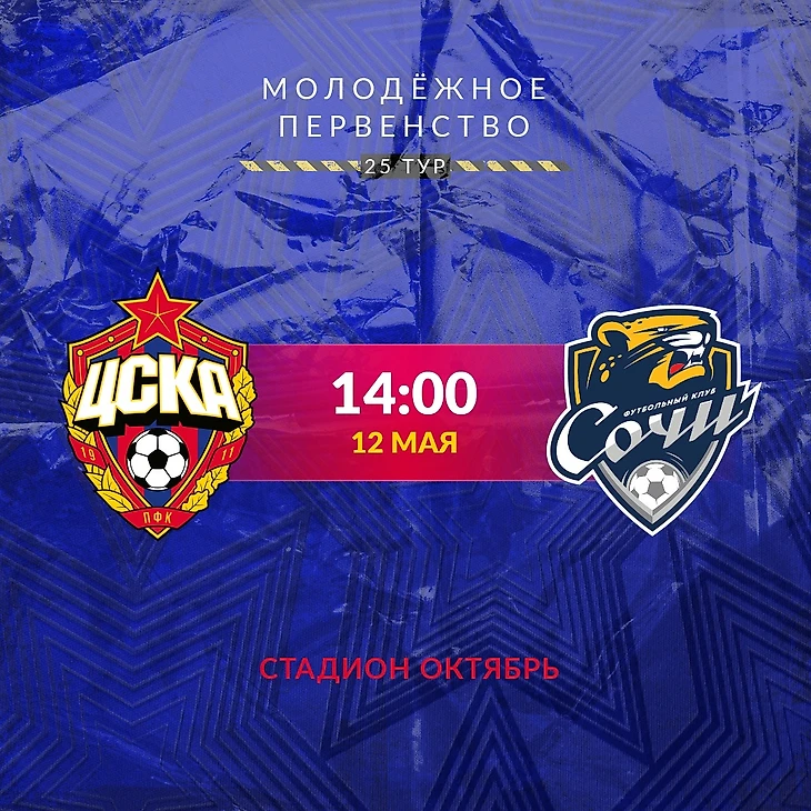12 мая на искусственном поле стадиона «Октябрь» (ул. Живописная, 21) состоится матч 25-го тура Молодежного первенства России ПФК ЦСКА — «Сочи». Начало в 14:00.