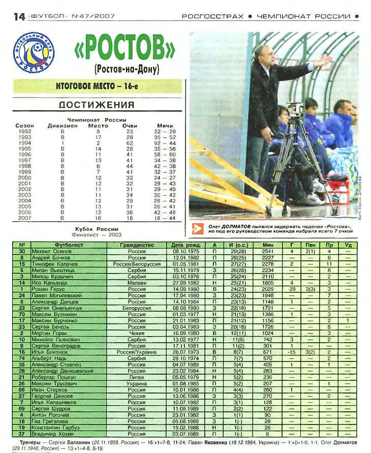 6 место. Ростов (Ростов-на-дону). Сезон 2007: +2=12-16, 18 очков, разница мячей: -26.