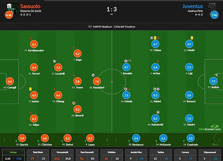 Матч между «Сассуоло» и «Ювентусом» завершился. «Юве» уверенно обыграл соперника на выезде (1-3).