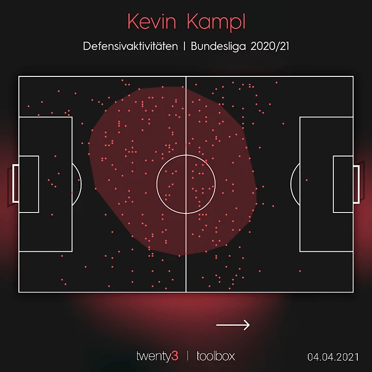 Одна из его отличительных черт, которая позволила Нагельсманну выстраивать такую игру с Камплем – умение охватывать сумасшедшие пространства на поле. И из всех, кто мог бы хоть частично компенсировать объем борьбы выпавшего Лаймера (который в сезоне-2019/20 был на первых местах среди игроков топ-5 европейских лиг по количеству оборонительных действий), он мог приблизиться в большей степени. И это отражается на карте его оборонительных действий с огромной площадью.
