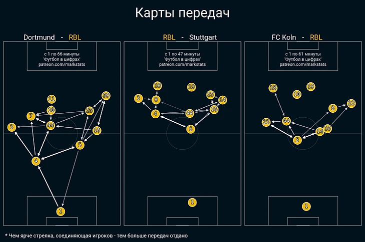 Но все же сложилось так, что сердцем системы Нагельсманна в сезоне-2020/21 стал Кевин Кампль. На большинстве карт средних позиций и передач (пусть и не на всех из-за присущей команде гибкости) можно увидеть схожую черту – Кампль фактически один контролирует центр поля, и через него идет без преувеличения все. Например, можно поставить рядом карты последних трех достаточно разных матчей «Лейпцига» в Бундеслиге, и эта особенность будет идти красной нитью через все три схемы.