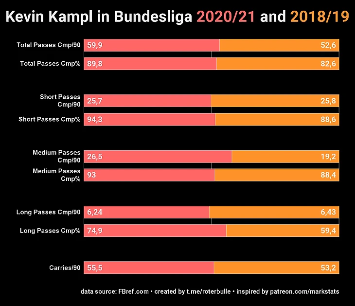 Еще одна черта, которая во многом помогла самому Камплю безболезненно вписаться в игру Нагельсманна – отличное качество и точность в игре с мячом. Не секрет, что одно из ключевых отличий футбола Нагельсманна от классических понятий «Red Bull футбола» упирается в больший акцент на владении и ориентирование именно на игру с мячом. И за эти два года Кампль, как и все в «Лейпциге», стал только лучше в этом направлении.