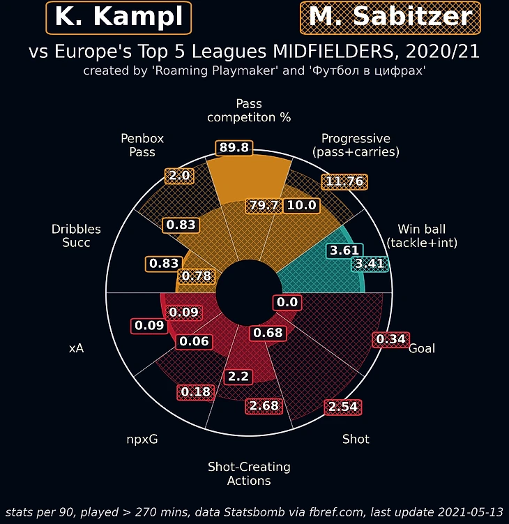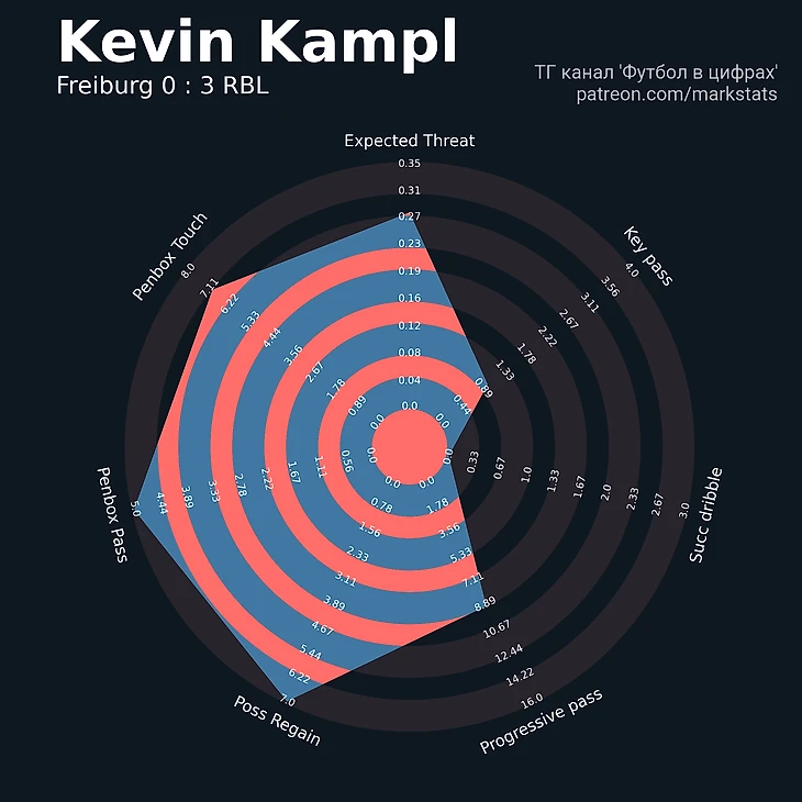 Однако, эта определенная «жертва» Кампля не означает, что он не способен в случае необходимости активнее идти в атаку. Один из самых ярких его матчей сезона – игра против «Фрайбурга» во втором круге (Забитцер пропускал ее из-за перебора желтых карточек). В том матче Кампль выдал запредельный уровень работы, сочетая и свою обычную роль, и как бы роль Забитцера. То есть, он сохранил свои средние оборонительные показатели, добавив к этому лучшие атакующие показатели в сезоне. По очкам xT (ожидаемая опасность от передач) в той игре его обошел только Кристо Нкунку.