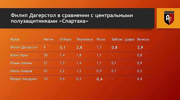 Так, например, если сравнить его показателями с игроками средней линии «Спартака», то окажется, что Дагерстол гораздо лучше идет в отбор, совершая в среднем 3,1 успешные попытки за матч. Из полузащитников красно-белых по этому показателю лучший Умяров (2,2), а во всем чемпионате из игроков, проведших не менее 5 матчей, этот показатель выше только у Максима Мухина из «Локо» (3,6), которым, по слухам, красно-белые интересуются, и Николая Золотова из «Урала» (3,4). Еще швед совершает больше перехватов, чем любой из спартаковцев (2,8), хоть это удел защитников, но и лучше блокирует удары соперников (0,8) и выносит мячи (2,9), а фолит немногим больше Крала и Зобнина (1,3 против 1,1).