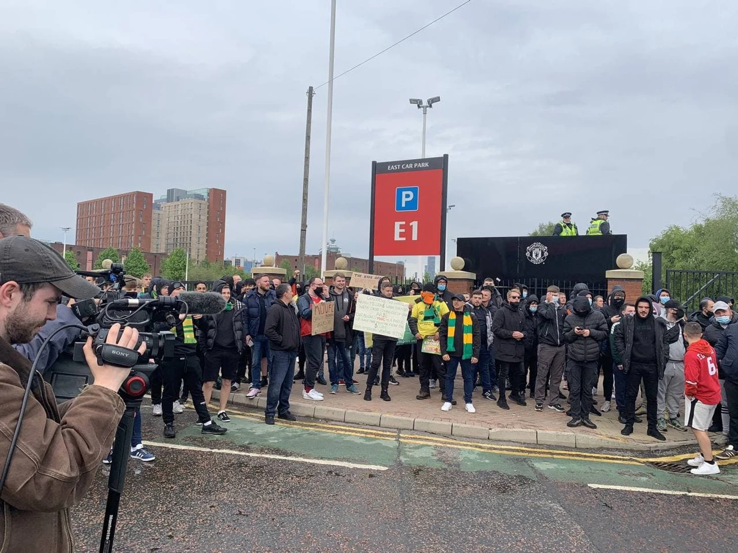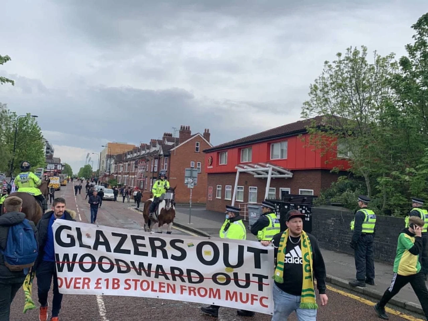 Протестующие начали прибывать на «Олд Траффорд» в преддверии перенесенного матча «Манчестер Юнайтед» - «Ливерпуль» с огромными табличками против Глейзеров.