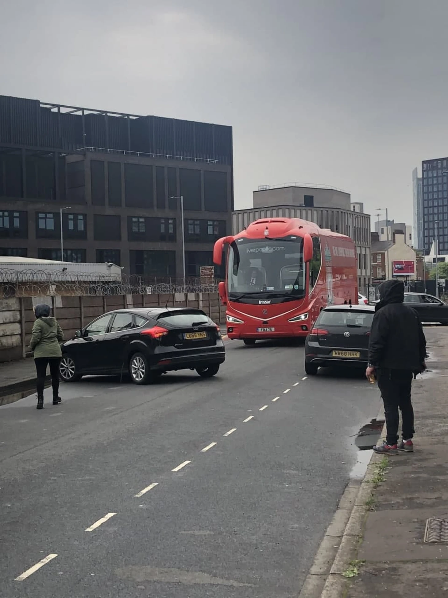 Машины заблокировали проезд автобуса «Ливерпуля» на стадион, но полиция уже прибыла на место происшествия и приказывает протестующим разойтись. Надеемся, это предотвратит его перенос, как 2 мая.