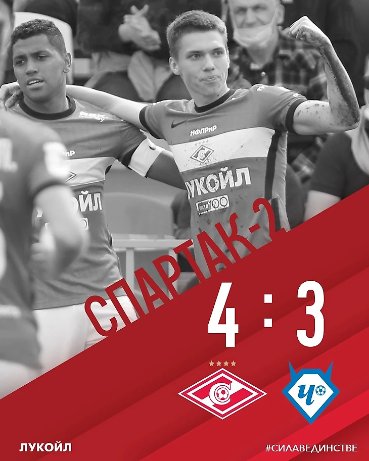 Сама игра получилась веселой и результативной. В первом тайме команды обменялись голами: спартаковцы пропустили первыми, но сумели отыграться благодаря точному удару Степана Мельникова с левой ноги. Сразу после перерыва чертановцы снова вышли вперед благодаря голу со штрафного. В ответ «Спартак-2» не просто отыгрался, но и повел с преимуществом в два мяча. Сначала после передачи Степана Оганесяна отличился Владислав Шитов, а затем Мельников сделал результат для команды — заработал пенальти, реализованный Педро Рошей, и потом забил сам, оформив дубль. А завершился непростой сезон для «Спартака-2» пропущенным мячом… от вратаря соперника. В компенсированное время Александр Радионов пришел на угловой и в борьбе с защитниками головой отправил мяч в сетку.