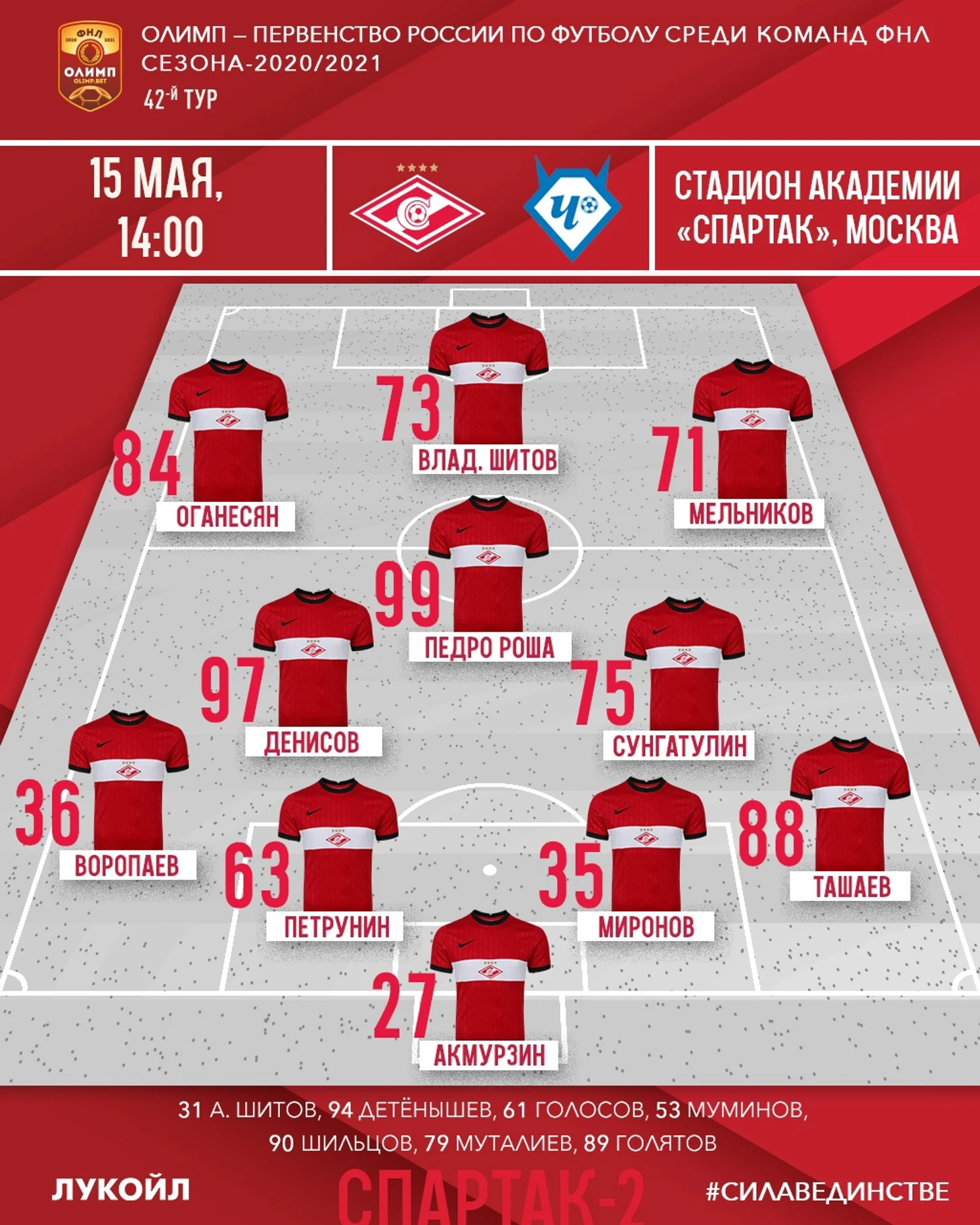 «Спартак-2»: Акмурзин, Ташаев (Голосов, 80), Миронов, Петрунин, Воропаев, Сунгатулин, Денисов (Муминов, 10), Педро Роша (к) (Шильцов, 85), Оганесян (Муталиев, 87), Мельников, Влад. Шитов (Голятов, 74).