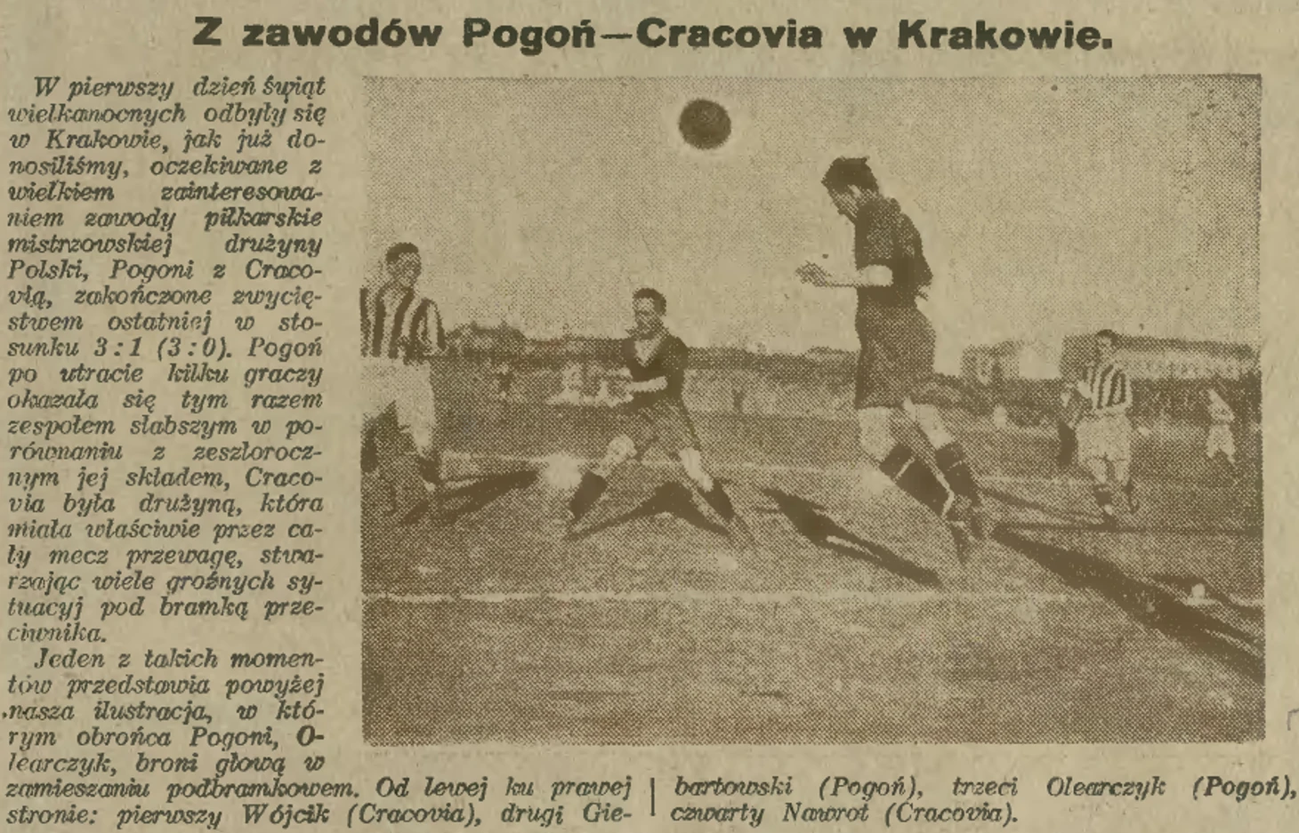 Итак, 21 августа 1921 года... 17:30 и первая игра Погони в сезоне, и сразу против прошлогоднего чемпиона Краковии, да еще и в гостях... Тренирует краковян Имре Пожоньи, который позде потренирует и Барселону. Состав у красно-белых из Кракова был горазло солиднее, а потому финальный свисток Кароля Баннерта зафиксировал уверенную победу хозяев 2:0, Мелех и Когут забили по мячу, а Котапка еще и пенальти не реализовал... Польская газета "Спортивный обзор" писала о том, что матч выдался эмоциональным, интересным, волнующим, о том, что каждый играл с полной самоотдачей. В каждом действии на поле у них проглядывался рисунок, желание и способность. На матче присутствовало 10 000 человек, 500 из которых приехали из Львова.