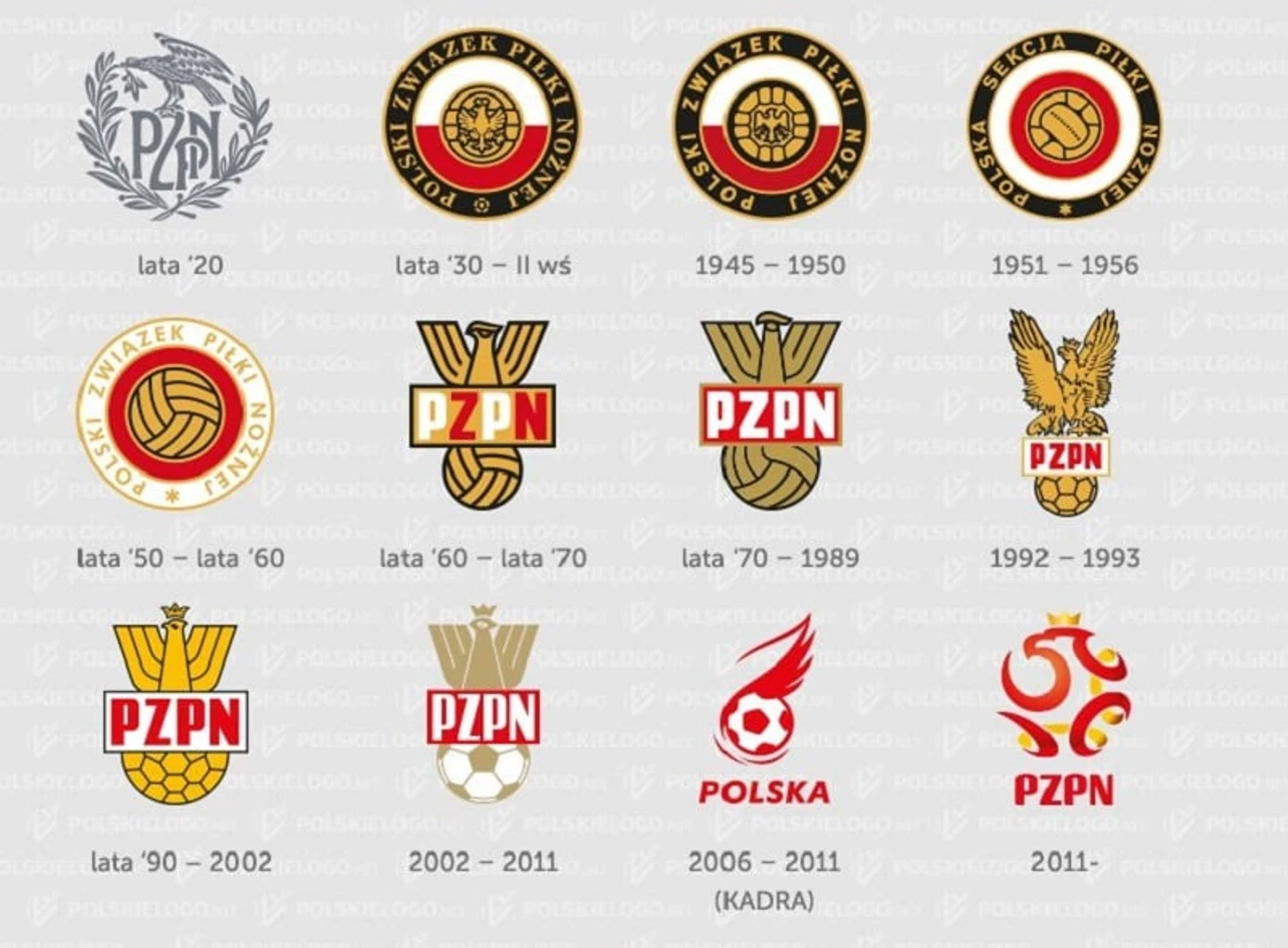 Эволюция логотипов Польского Футбольного Союза. Любопытно видеть самую первую эмблему (первая в верхнем ряду)