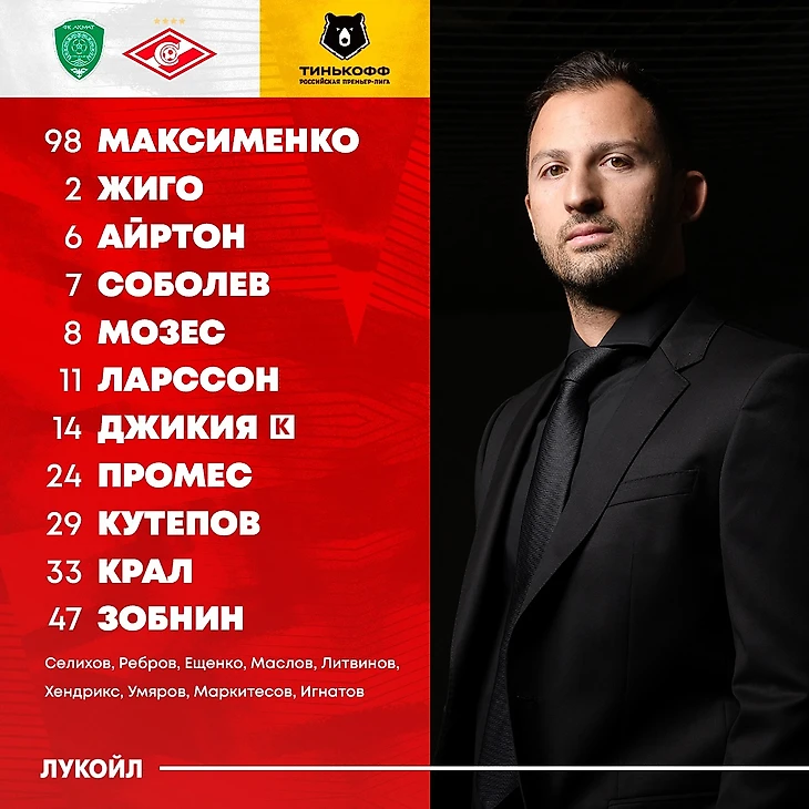 С первых минут сыграют: Максименко, Мозес, Кутепов, Жиго, Джикия (к), Айртон, Крал, Зобнин, Промес, Ларссон, Соболев.