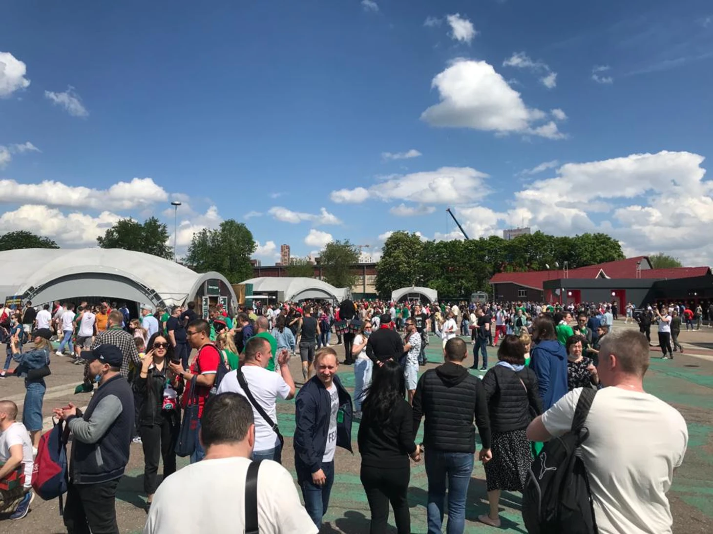 За 30 минут до игры вокруг стадиона уже было не пройти - все пространство заняли многочисленные болельщики с красно-зелеными шарфами и футболками, а ту часть стадиона, где болельщиков не было, оккупировала полиция. Хотя, силовиков было немного - видимо, взяли пример с Нижнего Новгорода, где на финал кубка полиции не приехало совсем. Там же незаметно прошел Мацей Рыбус со своим ребенком - не знаю, как он смог ходить вокруг болельщиков незамеченным и как его никто не узнал, видимо, спасла маска. Я же его уши и глаза узнал, но подойти и поздороваться не решился.