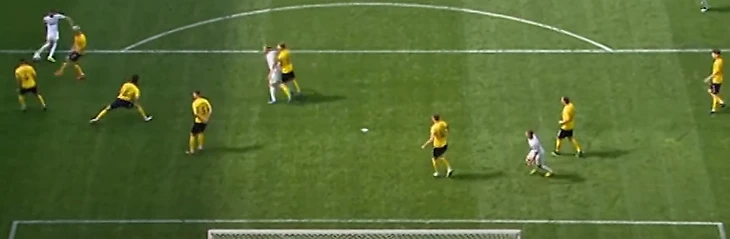 Раз уж мы начали с атаки, хотелось бы обсудить и гол забитый Ионовым. Хотя и был скорей всего небольшой офсайд, Ионов молодец, эти сантиметры — не вина Алексея, он не может контролировать столь малое значение, открываясь на грани офсайда.