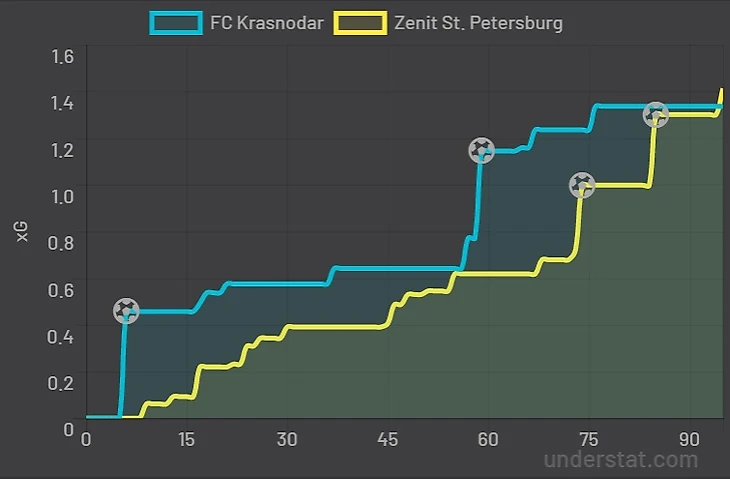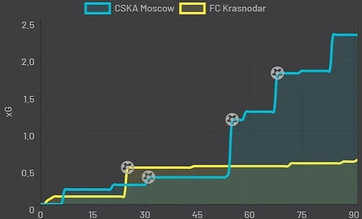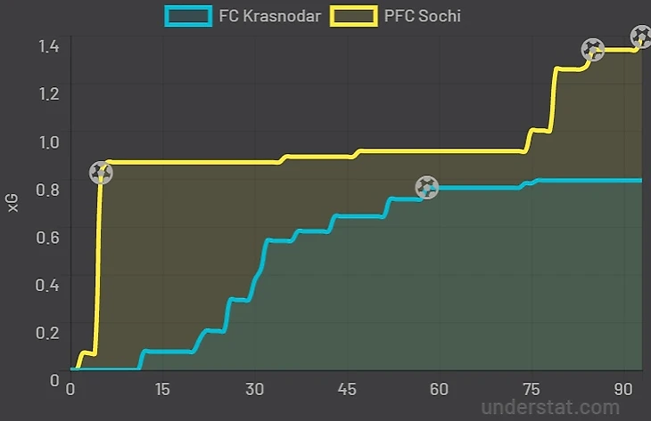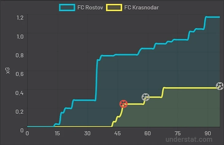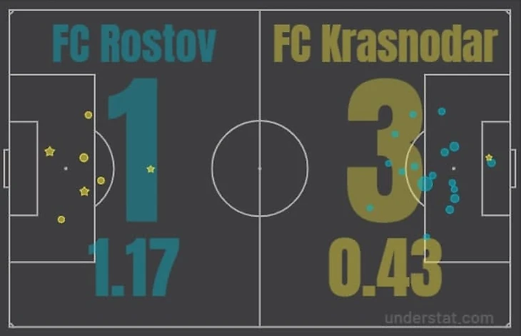 Краснодар забил три, но создал мало. Всего за матч накопилось 0,43 xG. Всего семь ударов было нанесено, ни один удар Быков не достигал показатель xG больше 0,10. Но это не только говорит о минусах Краснодара и о везенье, это так же говорит о великолепной реализации (3 удара в створ, 3 гола).