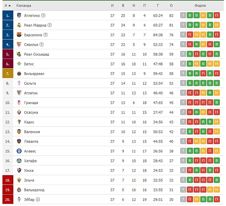 А вот и таблица испанского чемпионата. Команды с 16 по 8 место уже утратили какую либо необходимость сражаться за определенные позиции. В еврокубки им уже не попасть, да и в зону вылета не скатится. Эйбар в предыдущем туре схватил удар под дых и всё, боец покидает ринг. Вальядолид и Эльче похожи на утопающих собачек, выглядят мило, но как - то спасаться надо.
