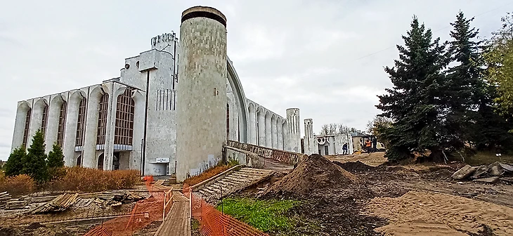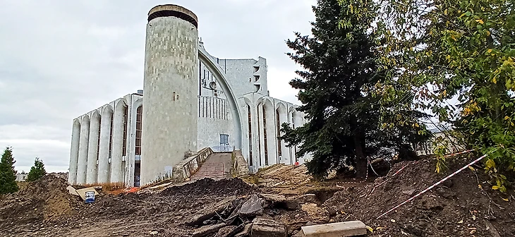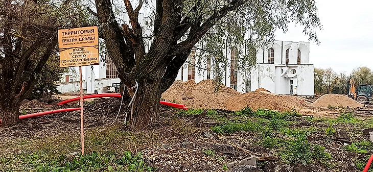 После решил 1,5 км прогуляться до Новгородского театра, прилегающую территорию которого сейчас облагораживают (когда если не осенью-зимой?). Театр предстал передо мной в необычном антураже: инопланетный красавец, в окружении территории как будто после массированного артиллеристского огня.