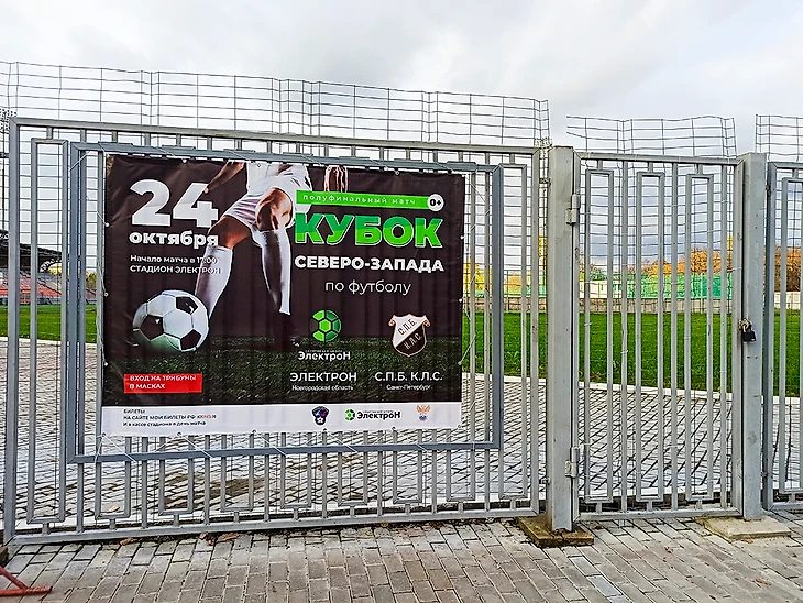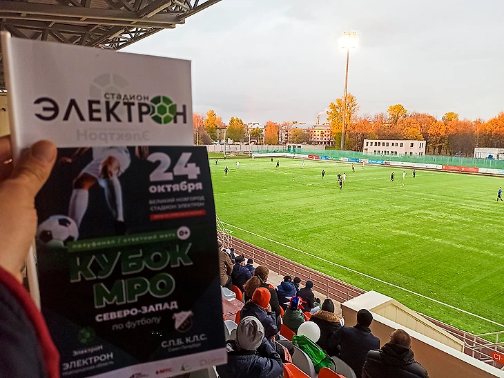 Вернувшись в город к стадиону «Электрон», я зашел в кассу купить билет на матч. Специально не стал покупать в интернете, чтобы осталась красивая бумажечка на память. Но как же я был удивлен, когда кассирша дала мне обычный чек и просила не выбрасывать его, потому что его нужно будет предъявить при входе. Зато рядом висела красивая афиша, и уже позже, когда я прошел на стадион, мне бесплатно выдали программку к матчу, обложка которой была оформлена так же, как афиша.