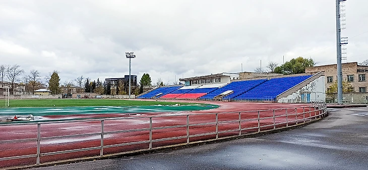 Перед поездкой я порылся в интернете и понял, что в этот день никаких соревнований на стадионе не планировалось, только в манеже какая-то гимнастика или что-то такое среди детей. Хотя, по идее, матчи недавно окончившегося первенства Новгородской области там проводились. Поэтому я довольствовался только прогулкой вокруг стадиона и лицезрением его через забор. Теперь можно на будущее ставить этот стадион своей граундхоппинг целью.