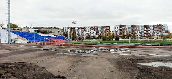 Итак, в 2015 году трибуны сломали, и, что удивительно для России, тут же начали строить новые. Планировалось сделать это место резервной тренировочной базой к Чемпионату мира, но потом передумали. Так и получилось, что построили только 1/3 стадиона. Кстати, тогда же хотели назвать его "имени Александра Невского", но тоже как-то не пошлО. Зато здесь 1,5 года в ФНЛ играла команда "Тосно" из Ленинградской области, причем собирая полные трибуны. Здесь же они и вышли в Премьер-Лигу.