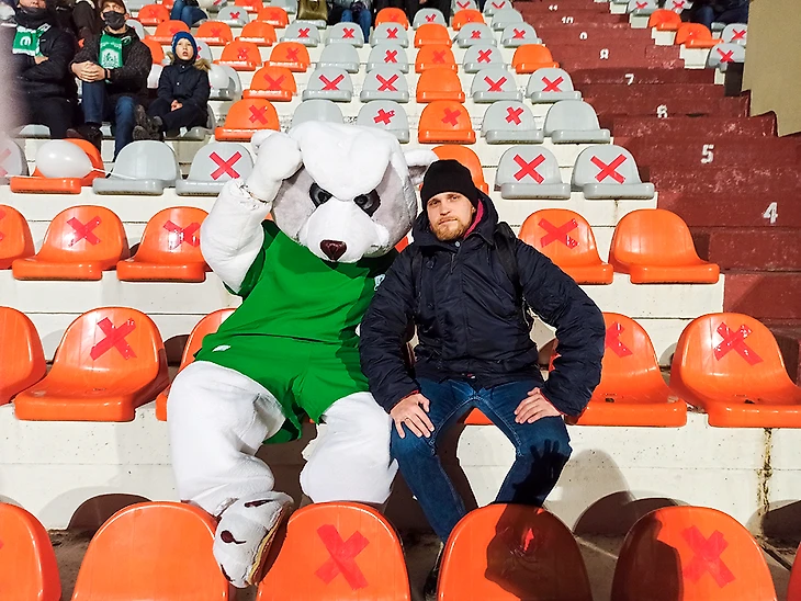 Еще из интересного: очень понравился харизматичный медведь Эл - маскот Электрона. А также над стадионом постоянно летали стаи уток. В городе я их в 99% случаев видел только плавающими в пруду, а здесь летали целыми стаями, штук по 10, и так раз 20 за матч. А ещё минут 15 я отвлекал от разминки одного из игроков ФК Спорт, который оказался моим коллегой с работы.