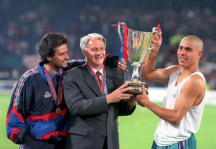 Жозе Моуринью, мэр Бобби Робсон и Роналдо с Кубком Кубков в составе "Барсы"