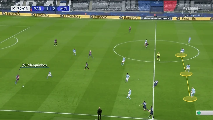 И если защитники "Манчестер Сити" обнаруживают возможную длинную передачу, они возвращаются назад, так что они уже движутся в правильном направлении, причем полубоком (как Ляпорт в примере выше), а не лицом вперед, что упрощает рывок для накрытия соперника. Вот пример из игры с ПСЖ, когда три защитника "Сити" следят за потенциальным лонгболом от Маркиньоса.