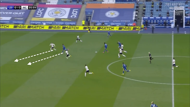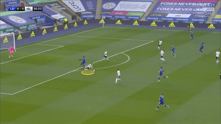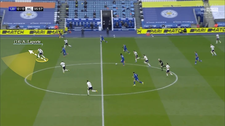 Даже на более детальном уровне позиционная игра защитников "Сити" помогает в сложных ситуациях. Недавно Джош Беднаш, тренер молодежи "Кристал Пэлас" и тактический аналитик "The Coaches’ Voice", опубликовал пример того, как Эмерик Ляпорт предотвращает прорыв "Лестера".
