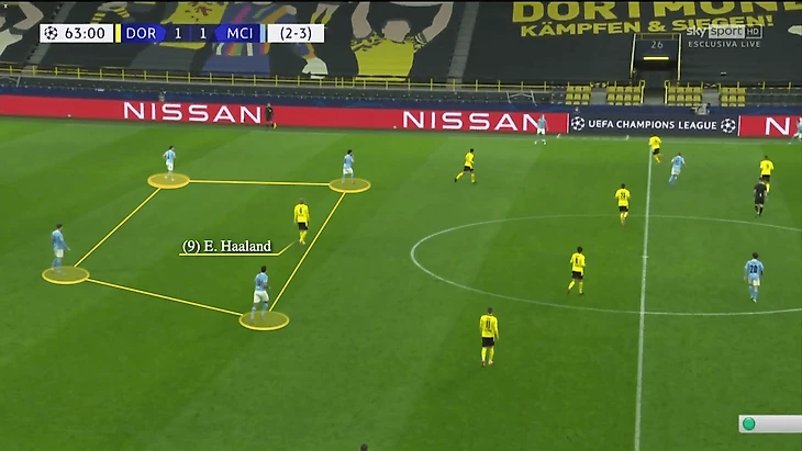 Но это может меняться в зависимости от соперника, и против "Боруссии" была проделана отличная работа - Холанд был изолирован клеткой из четырех или даже пяти игроков при защитной структуре 2-2 или 2-3 с широким расположением защитников.