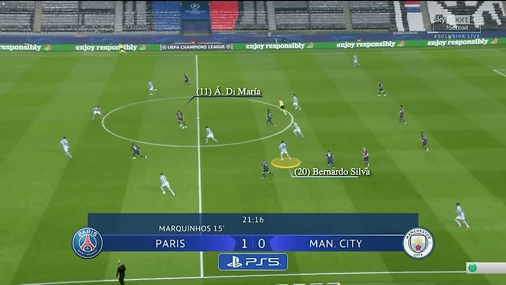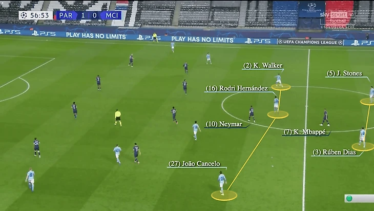 "ПСЖ" в первом матче против "Сити" (и в обоих матчах с "Баварией") обычно держал Мбаппе высоко: полузащита соперника была между Неймаром и Килианом , и команда Гвардиолы всегда обеспечивала необходимое прикрытие. В приведенном ниже примере это структура 2-3, которая сажала Мбаппе в коробку и перекрывала Неймара, задействуя при этом крайних защитников.