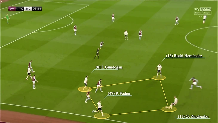 Таким образом, в случае потери мяча, "Сити" уже имеет игроков в позициях, позволяющих немедленно встречать соперника.