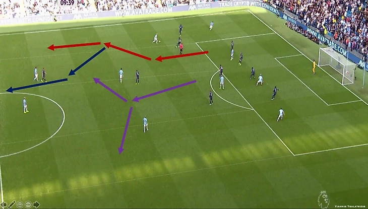 "Если контратакующий соперник изберет "фиолетовый" маршрут, то мячу будет некуда деться, кроме как отправиться шире, потому что "Сити" отлично использует полупространства и держит в середине четырех игроков.".